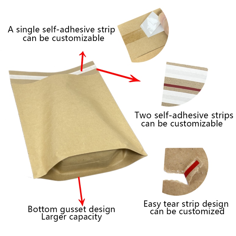 Ezaugarri: Kraft Paper Postagailu biodegradagarria iragazgaitza den errendimendu ona, ez da egun euritsuen beldurrik; Erabilera super itsasgarri, gomazko zigilatzea suntsitu, pribatutasuna babestu, pribatutasuna ona da.